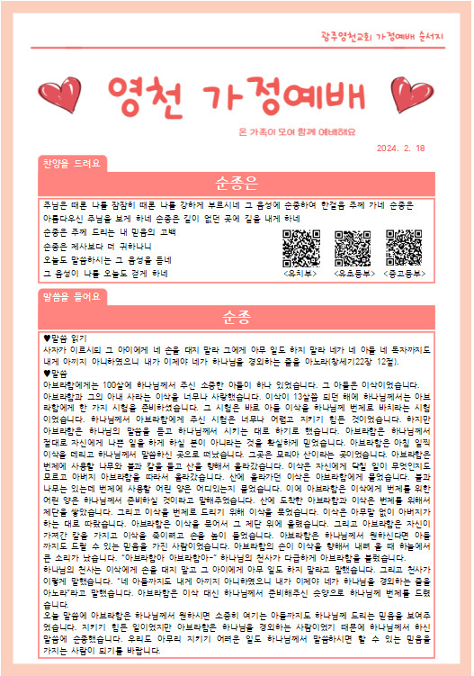 2월 첫째주 가정예배 순서지
